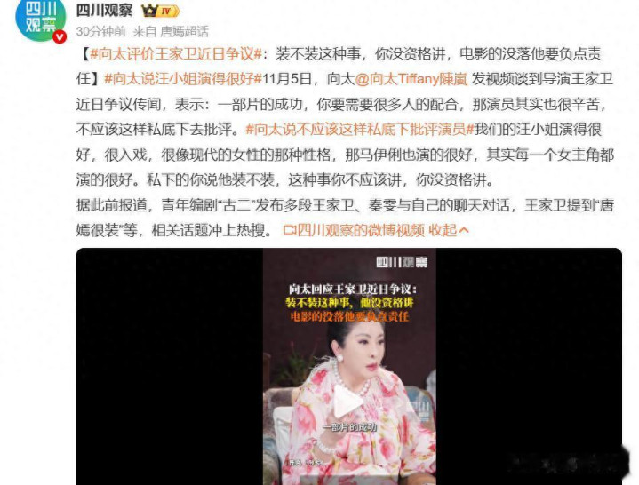 2025年11月5日,这一天娱乐圈可谓是“波澜壮阔”。向太(陈岚)发布了一则视频,在视频中她言辞激烈地痛批王家卫。向太直言“才华不是傲慢的资本”,这句评论可谓一针见血。她甚至说出“没有张叔平,王家卫是个屁”这样犀利的话语。张叔平是电影界赫赫有名的美术指导和服装造型师,与王家卫长期合作,参与了《花样年华》《一代宗师》等多部经典影片的创作。向太此言论暗示了王家卫的成功或许离不开张叔平的助力。更引人注目的是,向太还指责王家卫需为电影行业的没落负责。电影行业的发展受到多种因素的影响,如市场环境、观众需求变化等,但向太将部分责任归咎于王家卫,这一观点无疑在娱乐圈掀起了轩然大波。