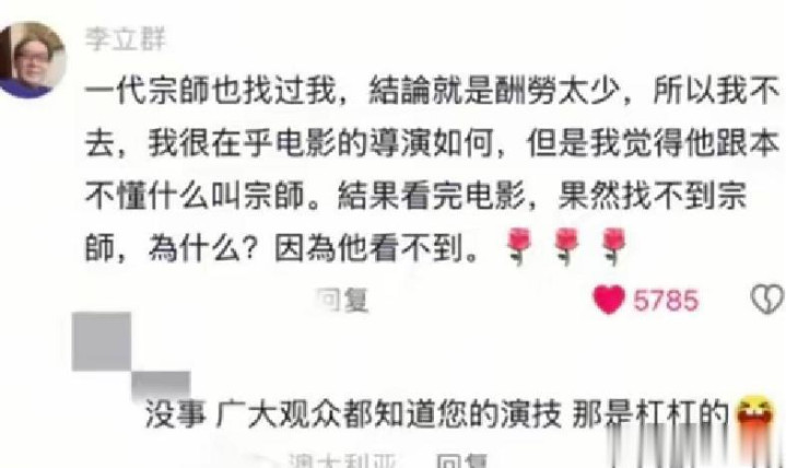 李立群在看到向太的视频后,迅速在评论区声援。他自曝曾因“酬劳太少”拒绝了《一代宗师》的邀约。《一代宗师》是王家卫耗时多年打造的一部武侠巨作,汇聚了众多知名演员,在国内外都获得了极高的赞誉。李立群表示自己当时认为片酬与自己的付出不匹配,所以选择了拒绝。他还直言:“王家卫根本不懂什么叫宗师,看完电影也找不到宗师,因为他看不到。”在传统观念中,“宗师”代表着在某一领域有卓越成就、德高望重的人物。李立群认为王家卫没有在电影中展现出“宗师”应有的特质,这一言论迅速引爆了热搜,被多家媒体引用报道。媒体的广泛传播使得这一事件进一步发酵,引发了网友们的热烈讨论,大家纷纷在社交平台上发表自己的看法,支持李立群和支持王家卫的两派观点争论不休。